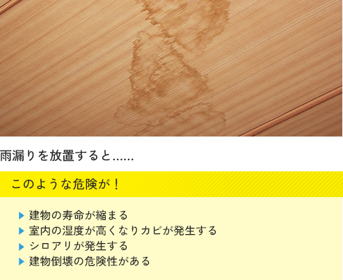 また雨水は木の部分に染み込み、金属部分は錆びによって腐食や劣化が進みます。天井や壁にシミが見受けられた場合は、早めにご相談ください。