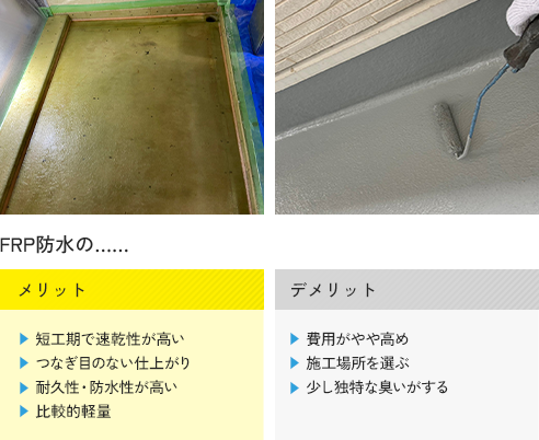 FRP防水とは、木やコンクリートで作られた床の上にFRPのシートを敷き、その上に樹脂を塗って硬化させる方法。硬化後は、プラスチックのような硬さが感じられる床面になります。